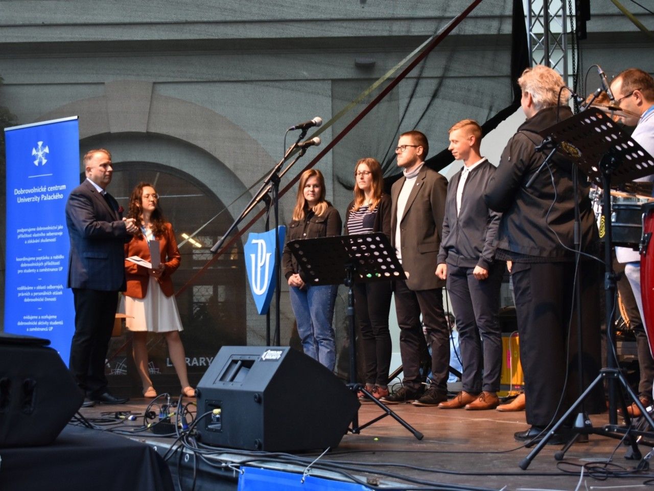 Pódium na nádvoří Zbrojnice patřilo během festivalu MEET UP nejen hudebníkům, ale také studentům a zaměstnancům UP, kteří věnují svůj čas nezištné pomoci druhým a kteří mohou být inspirací pro ostatní. Rektor Martin Procházka představil letošní laureáty Ceny rektora pro dobrovolníky a poděkoval jim za jejich činnost.